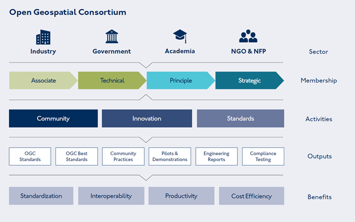 The Open Geospatial Consortium (OGC) contributes to the IGIF-MSDI Maturity Roadmap by providing key considerations around the implementation of Standards, alongside an active cross-sector global forum to share applied knowledge, cooperate on emerging technologies, and collaborate on standards development. The engagement of the OGC membership is vital for the realisation of cost-benefits stemming from common implementation across different countries, regions, applications, and socio-economic domains.