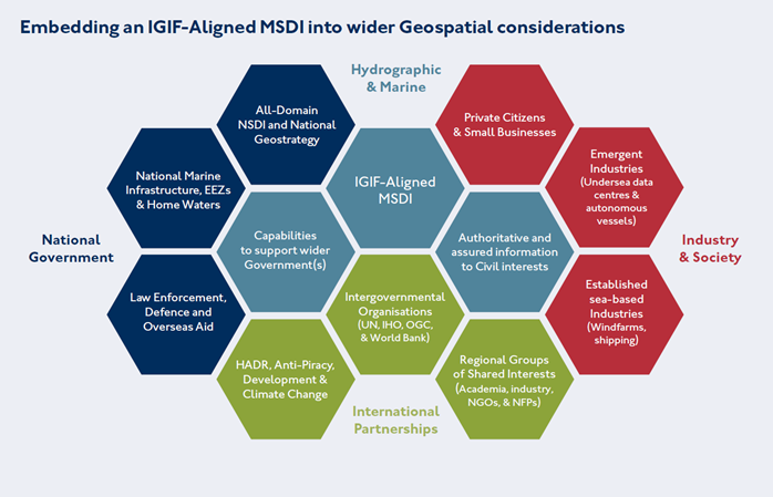 As part of the OGC’s FMSDI initiative, the IGIF-(M)SDI Maturity Roadmap as structured by the UK Hydrographic Office and international partners such as the World Bank, seeks to advance Marine and Terrestrial IGIF integration. One of the key messages therein is that an (M)SDI is a continual journey and not an end-state of expensive technological solutions. It asserts that nations are sovereign in what manner of (M)SDI they genuinely need for their national requirements, not by an externally imposed or presumed level of technological sophistication (unless otherwise chosen).