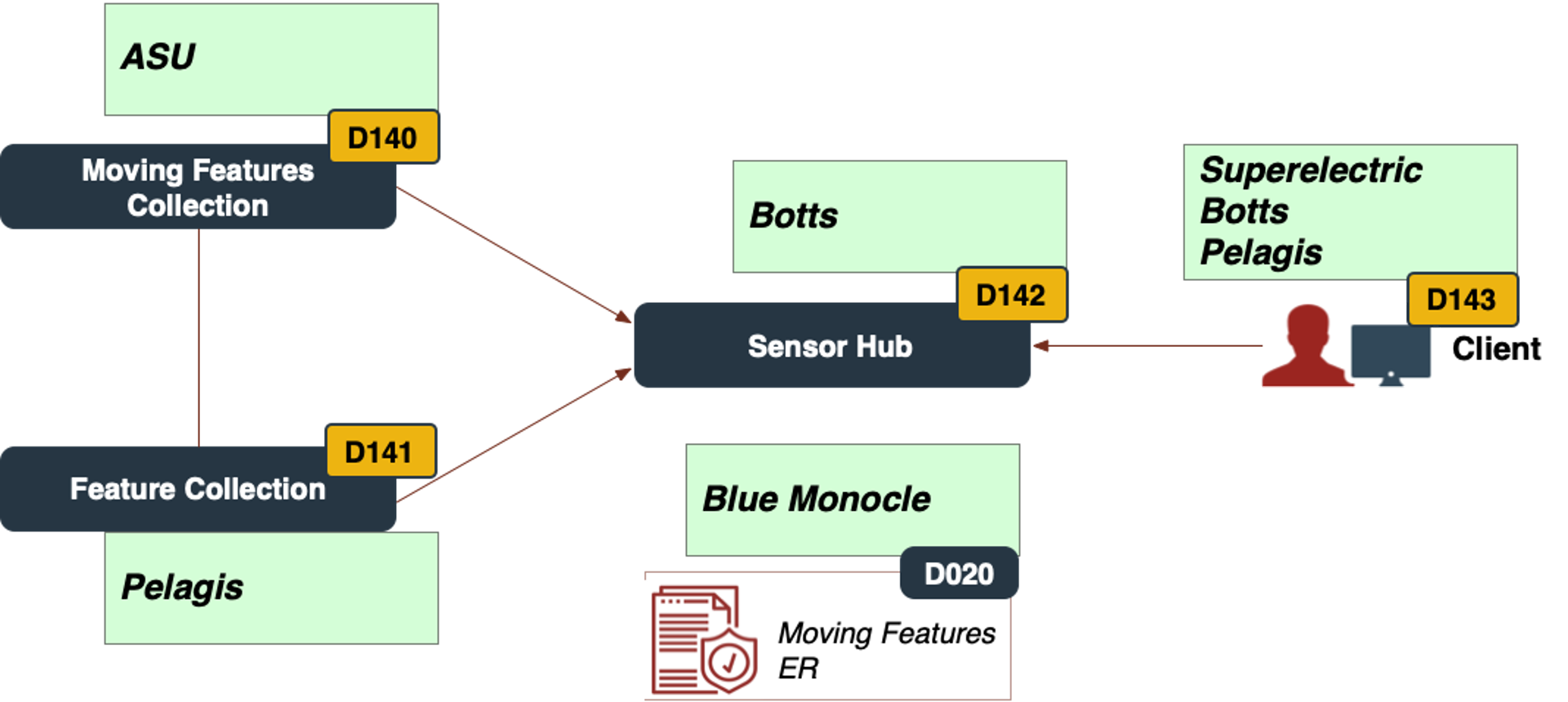Moving Features and sensor integration will lead to a robust framework of standards that enables interoperability for a wide spectrum of sensors, command and control systems, and analytical systems. The participants and their roles in this task are presented in the figure below: