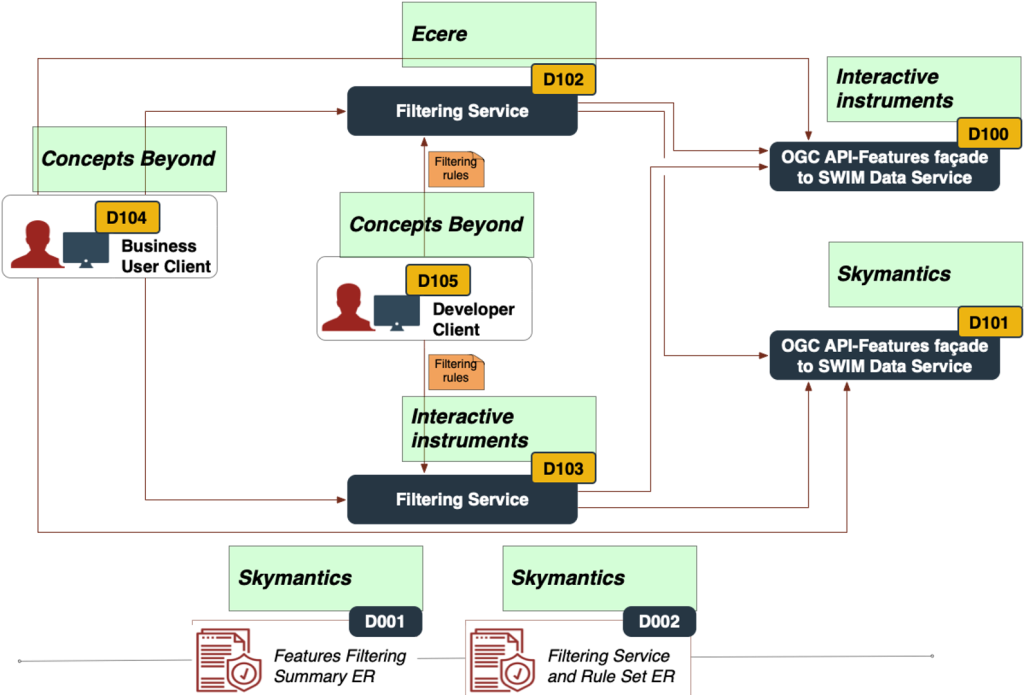 Testbed 18’s System Wide Information Management (SWIM) task explores filtering mechanisms for feature data served by OGC API-Features instances. The task components and their participants are presented in the figure below: